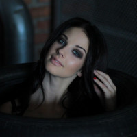 an intense look on her face and is looking directly at the camera. The setting seems to be indoors, with visible industrial or factory elements such as pipes and