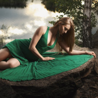 На картинке изображена женщина в зеленом платье, сидящая на камне у края воды. Она смотрит налево с созерцательным выражением. На заднем плане есть деревья и водоем, напоминающий озеро или прибрежную зону. Освещение предполагает, что это может быть поздно вечером или ранним вечером.