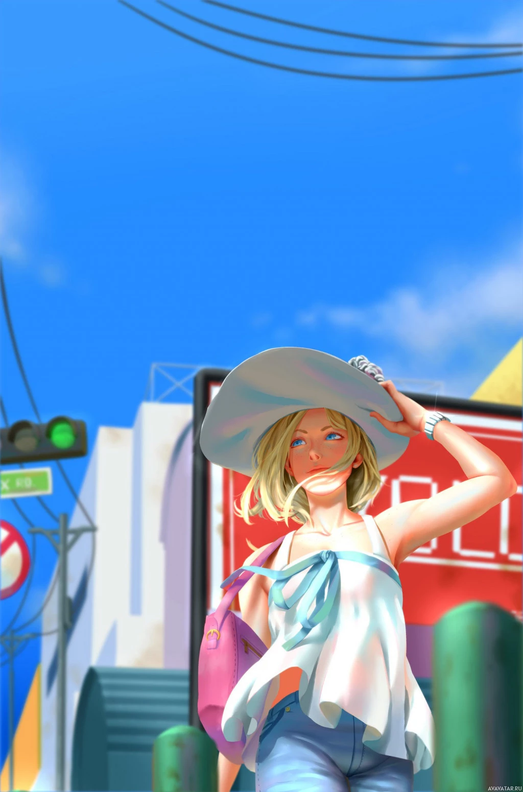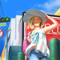 a young woman with blonde hair. She's wearing a sun hat, sunglasses, and is dressed in summer attire that includes jeans shorts,