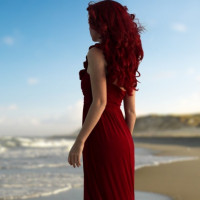 red dress that flows into the sand, and she has her hands slightly raised as if in a pose or perhaps feeling the ocean breeze. The