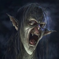 a fantastical creature that appears to be a mix of a human and a monster, often associated with horror themes. It has exaggerated features such as sharp teeth,