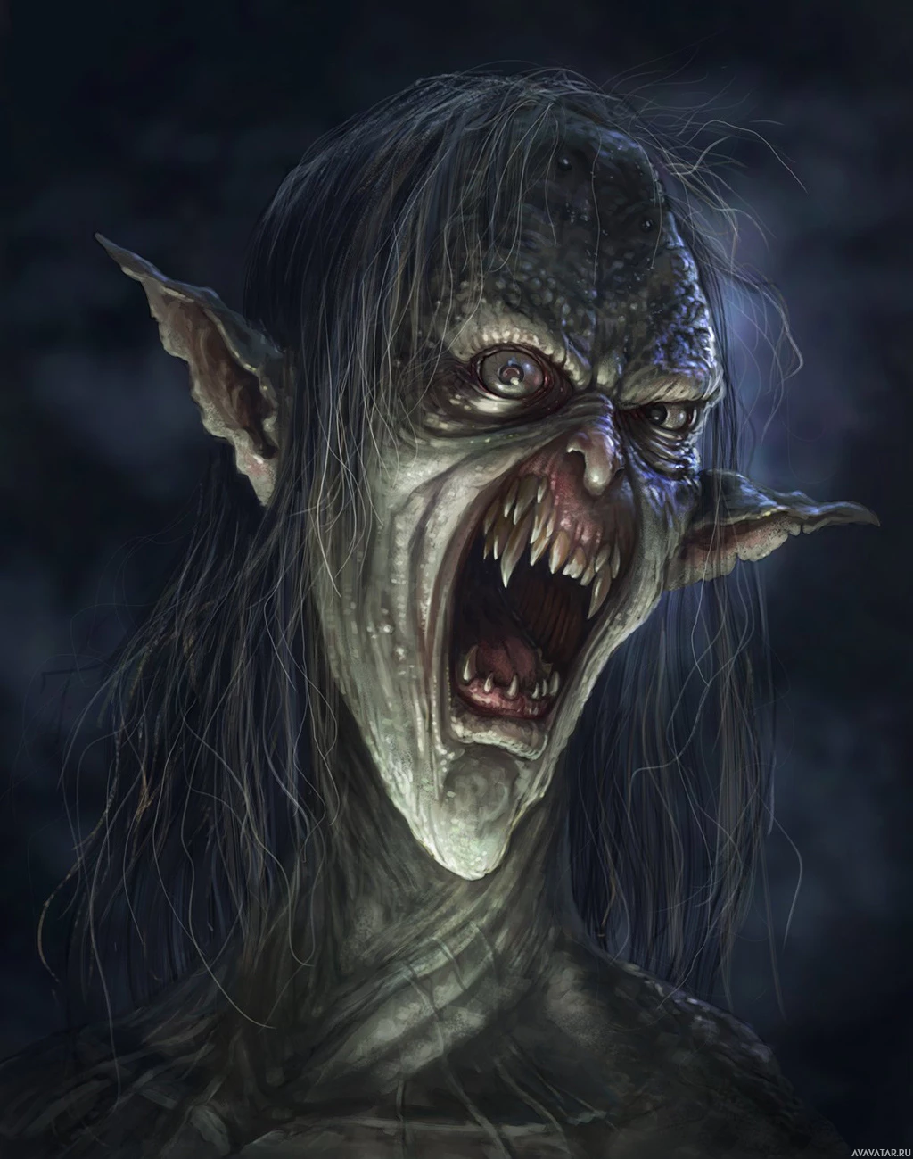 glowing eyes, and an aggressive expression, which contribute to its menacing appearance. This type of creature is commonly found in horror or fantasy genres, where it may be portrayed as a fearsome antagonist or a symbol of