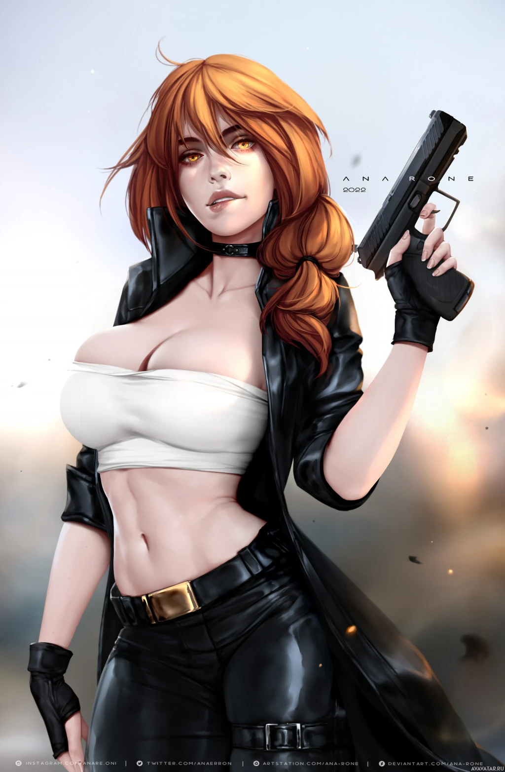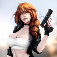 a dynamic pose, holding what appears to be a pistol with confidence. The character is wearing a black