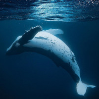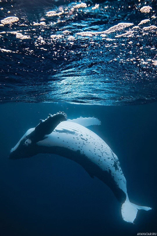 На картине изображен горбатый кит, ныряющий под водой. Его голова видна, с большими ластами и хвостовым плавником, тянущимся позади него, когда он движется через воду.