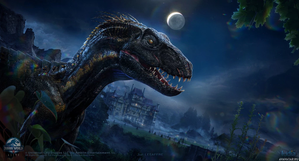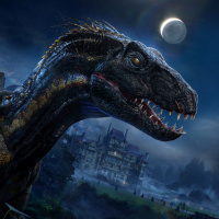 The image shows a creature that resembles a dinosaur, possibly a T-Rex, standing in the foreground. It has a distinctive appearance with spiky patterns on its body and