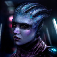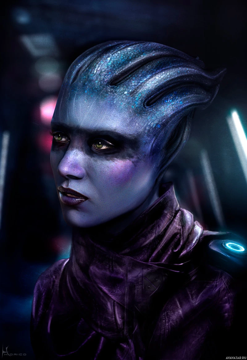 the video game "Mass Effect," specifically Azari. She is known for her role as an alien with unique purple and blue skin, which is characteristic of her