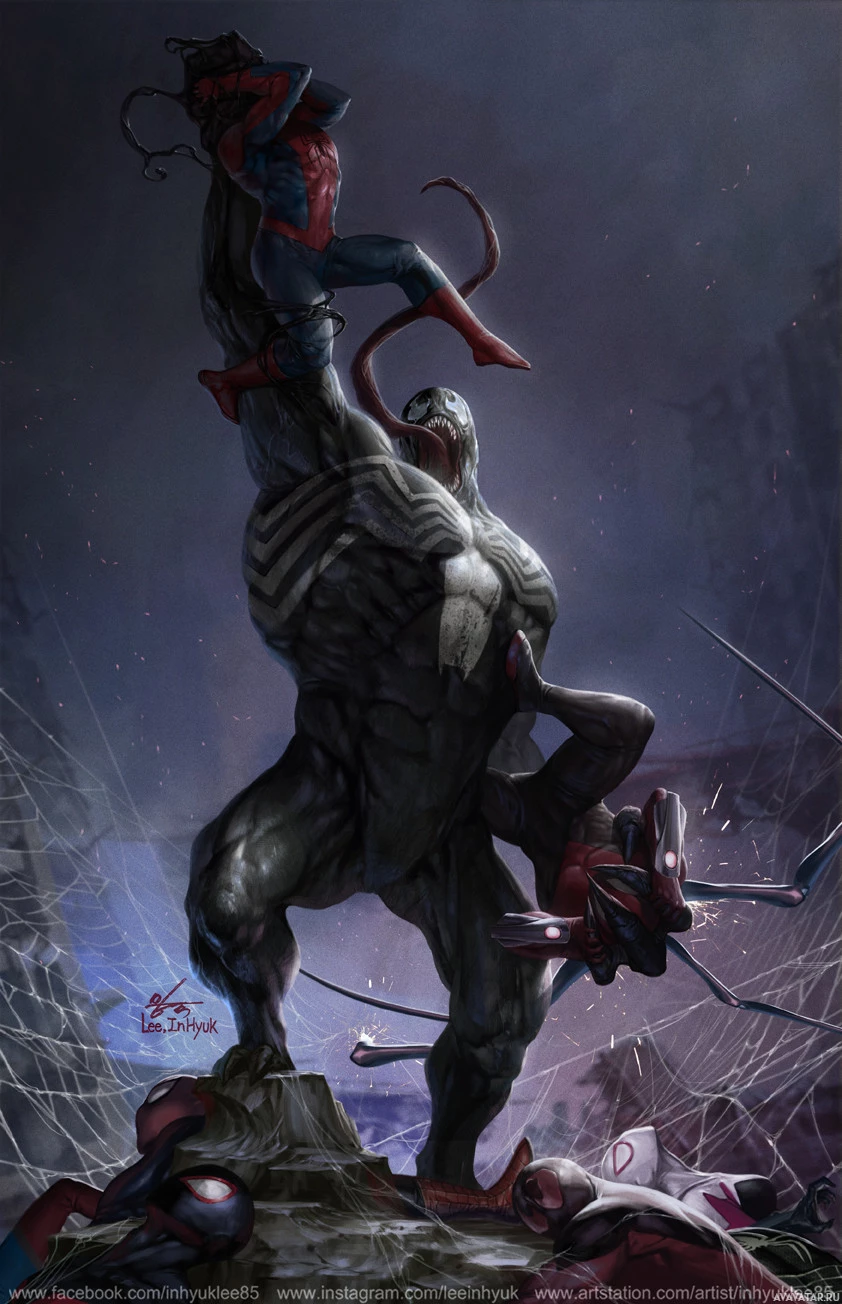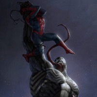 a dramatic scene featuring characters from the Marvel Comics universe. In the foreground, Spider-Man is seen with his arms outstretched as if he's either protecting or attacking Venom. Venom, on the other hand, is shown in