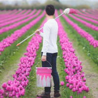 pink paint and a brush, suggesting they might be involved in painting the flowers or maintaining the field. It's important to note that any action related to this image would need to respect environmental conservation practices and not damage the tulips or their