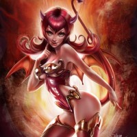 red horns and is adorned in what looks like demonic or infernal attire, with a red skirt and horn-like accessories on her head. The character is depicted in