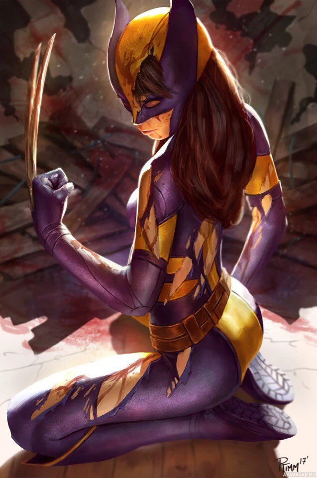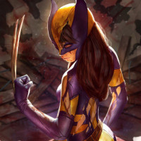 a female character who appears to be from the X-Men universe. She is sitting with one hand on her hip and the other arm extended in a defensive or ready posture. Her costume consists of purple and gold accents, with visible claws on her hand, which are characteristic of the X-23 character known as Laura Kinney from the comic