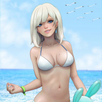 blonde hair with a styled cut. The character is holding onto an inflatable flotation device and seems to be standing on
