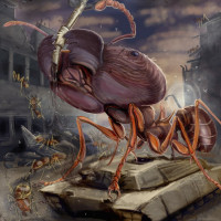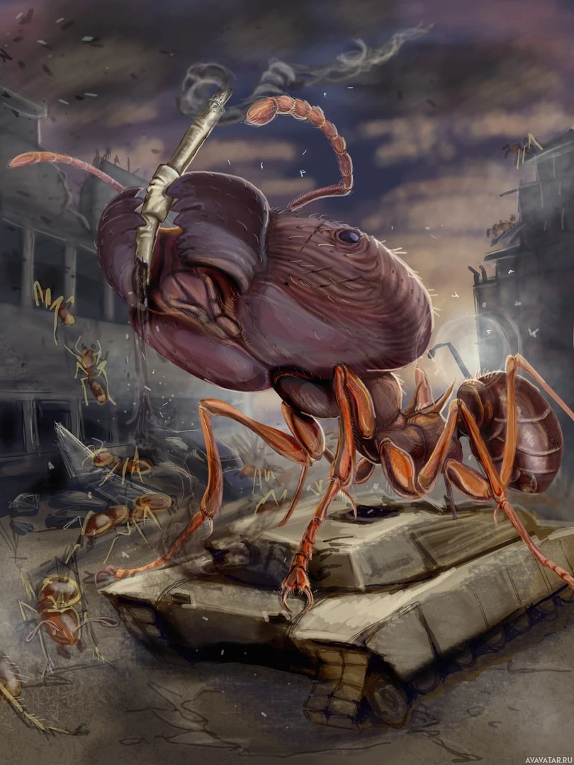 a helmet with a visor, adding to its anthropomorphic appearance and suggesting it might be leading or commanding an army of ants. This image combines elements of