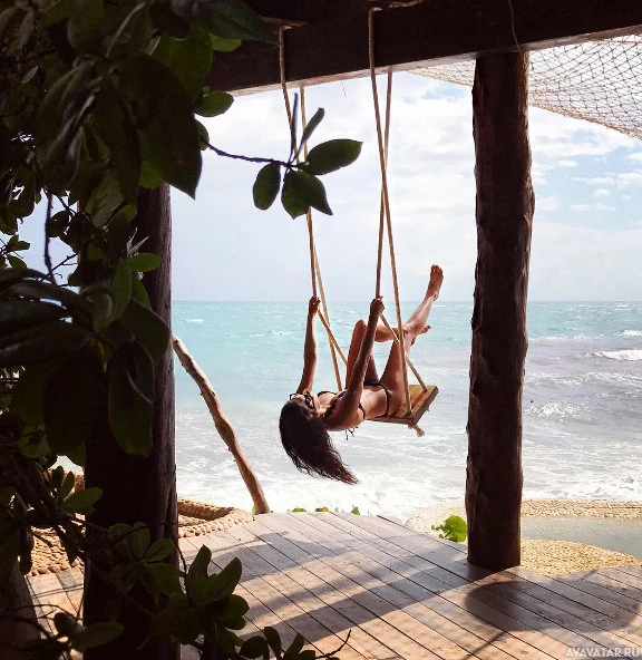 На снимке изображена женщина, качающаяся на гамаке. Она, кажется, наслаждается спокойным моментом, возможно, на пляже, учитывая песок и воду, видимые на заднем плане. Это похоже на солнечный день с ясным небом.