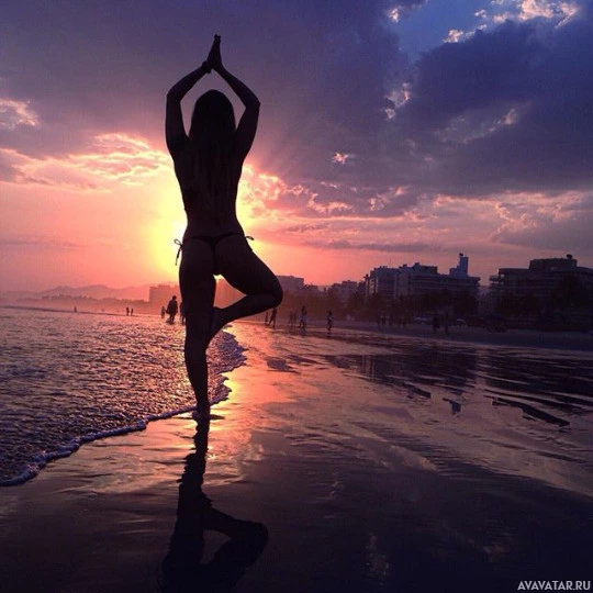 На картинке изображен силуэт человека, выполняющего йогу на пляже во время заката или раннего утра, о чем свидетельствуют теплые оттенки в небе. Он захватывает момент спокойствия и отражения, а форма фигуры выделяется на фоне мягкого освещения.