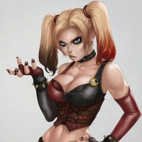Harley Quinn, a fictional character from the Batman series. She's known for her distinctive pigtails with red and black hair, wearing a corset, thigh-