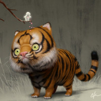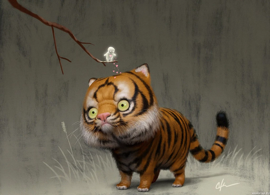 white bird perched on the tiger's back. The artwork seems to depict an anthropomorphic