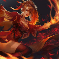 a sleeveless dress and has flames surrounding her hand, suggesting she may have the ability to control or harness fire. This character resembles
