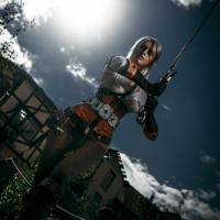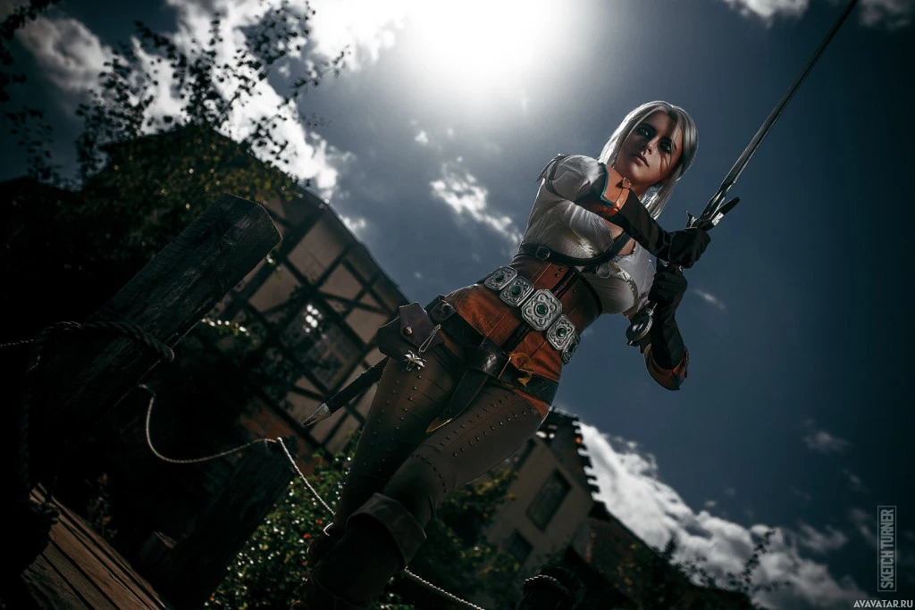 game series. This character, known as Ciri, is standing outdoors with