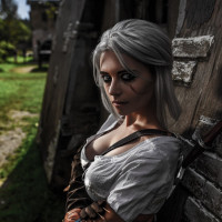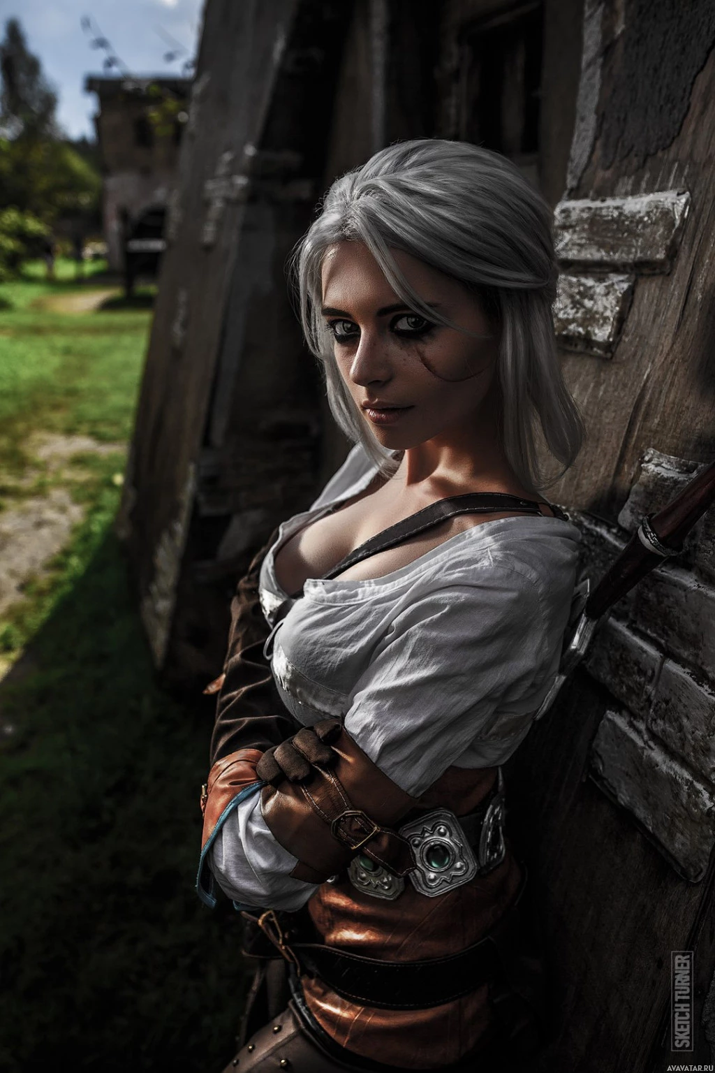 The image features a character known as Ciri from "The Witcher" game. She is portrayed in her iconic armor, complete with a sword and a bow, standing next to what appears to be an old stone structure that might suggest a setting related to