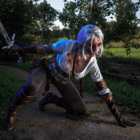 The image shows a person dressed in costume, portraying the character Ciri from the video game "The Witcher 3: Wild Hunt." They are standing outdoors with trees and bushes around. The character is holding a sword and has a determined or aggressive posture, which suggests they may be in the middle of a combat scene within the game.