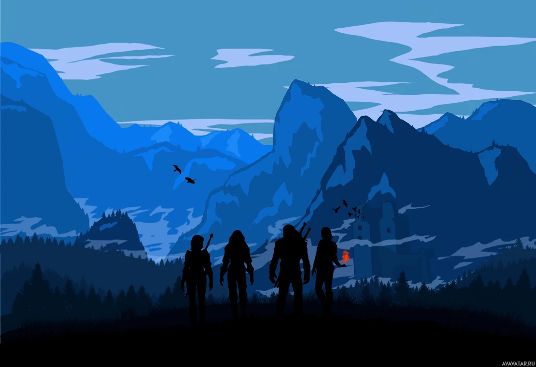 birds in flight against the sky, contributing to the sense of a living ecosystem. The image is often associated with "The Witcher" game due to its style and setting that resembles scenes from