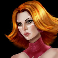 a red top, a gold necklace, and what appears to be a staff or wand in her hand.