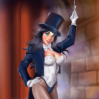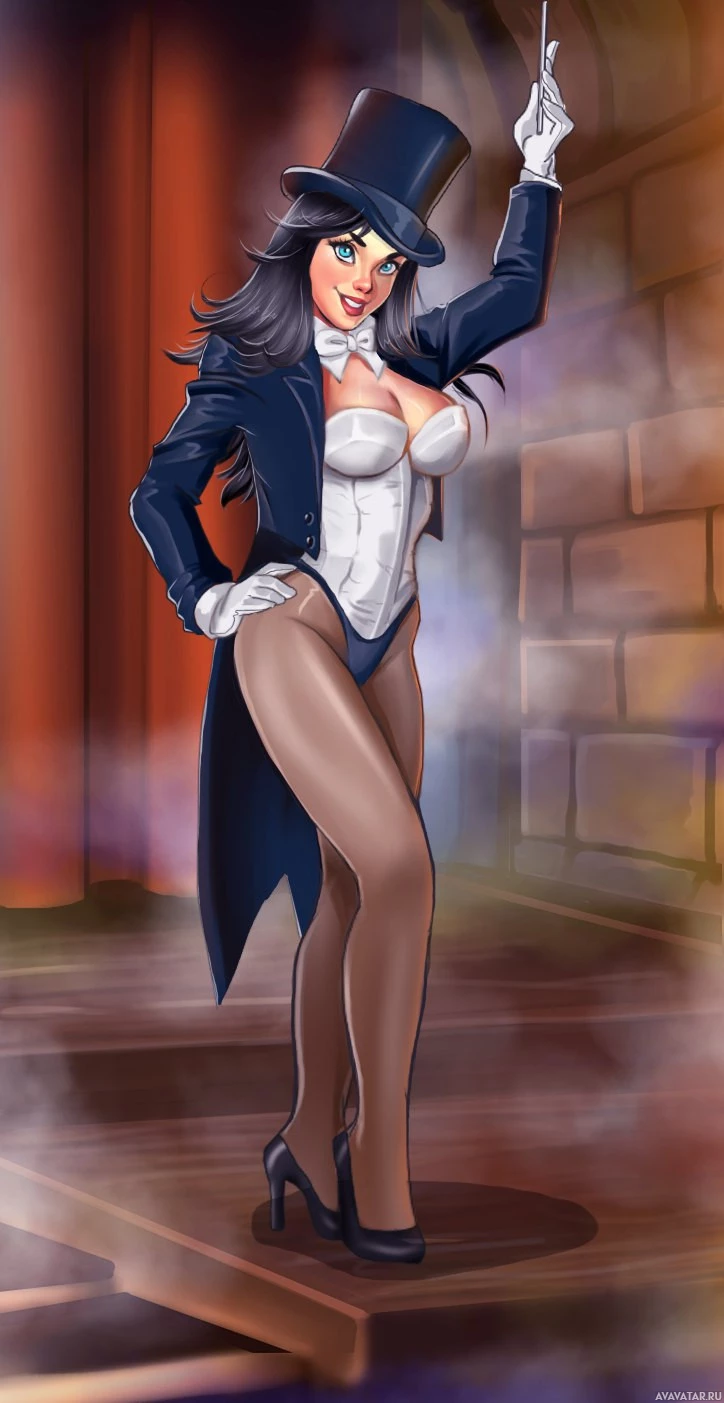 The image depicts a character in an artistic illustration, styled as Zatanna, who is known for her stage