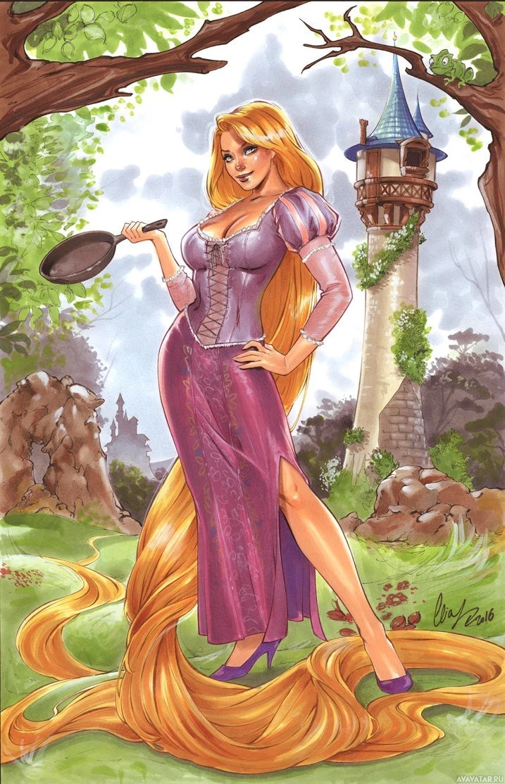 a castle in the background, holding up a pan. Her hair, a key characteristic of