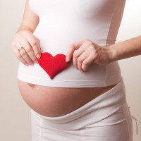 The image shows a woman who is pregnant, as indicated by the visible bump and the maternity clothing she's wearing. She holds a red heart-