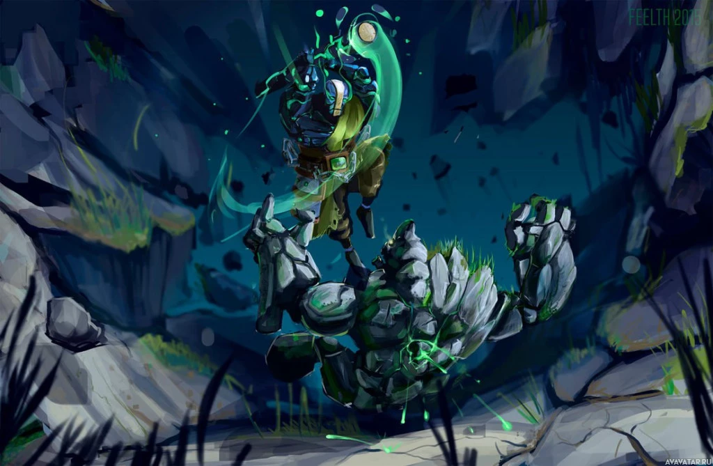 Earth Spirit, and is one of the heroes in the game. The artwork shows Earth Spirit with a glowing green aura around him, standing amidst what appears to be