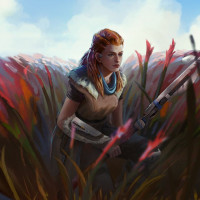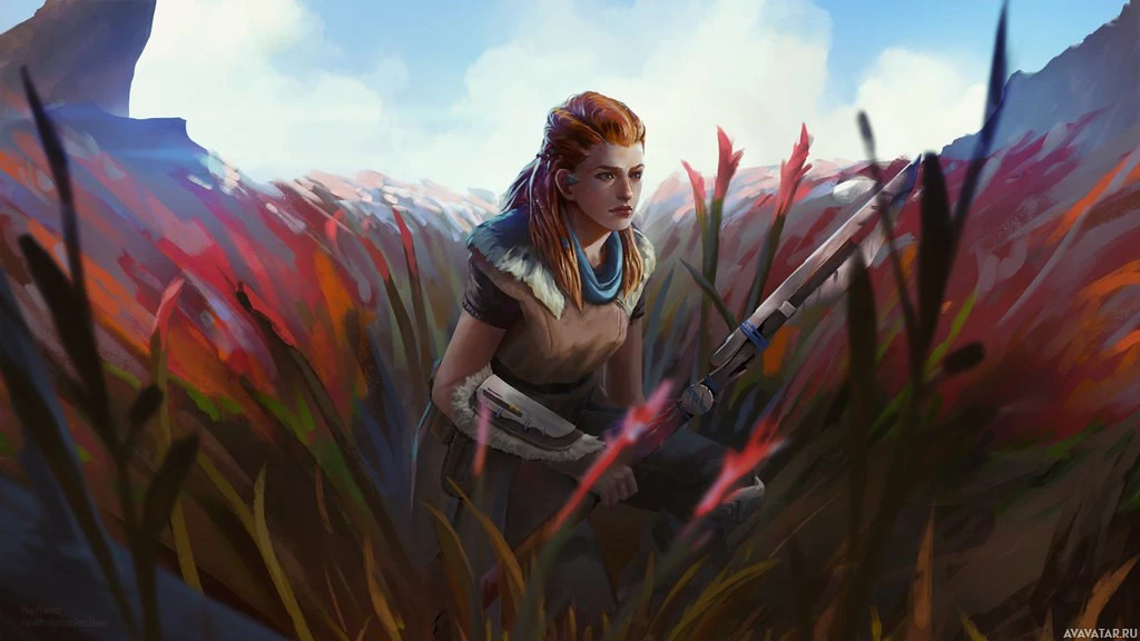 На снимке изображен персонаж из видеоигры «Horizon Zero Dawn». Она выглядит как искусственный интеллект или роботизированное создание, разработанное с человеческими чертами. Персонаж изображен сидящим на травянистой местности, предполагая, что она может быть в естественной среде в игровом мире.