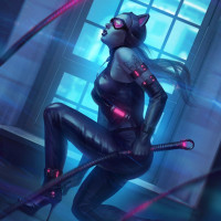 the Batman franchise. She is depicted crouched down on what appears to be a rooftop, surrounded by dynamic