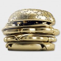 The image shows a golden hamburger, which is an unconventional and artistic representation of food. It appears to be a 3D rendering or a digitally altered photograph, as the gold foil effect is not typical for actual food items. The concept behind this image could be symbolic or simply an artistic expression.