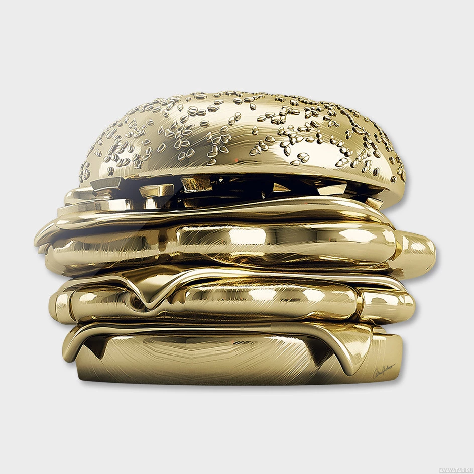 На картинке изображен золотой гамбургер, представляющий собой нетрадиционное и художественное представление еды. Это 3D-рендеринг или цифровая фотография, поскольку эффект золотой фольги не характерен для реальных продуктов питания. Концепция этого образа может быть символической или просто художественным выражением.
