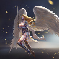 The image depicts a female character with angelic wings and a sword. She appears to be in mid-flight, surrounded by particles that could suggest motion or the magical nature of her abilities. The artwork is detailed and stylized, likely intended for fantasy purposes such as illustrations in games, novels, or other creative works.