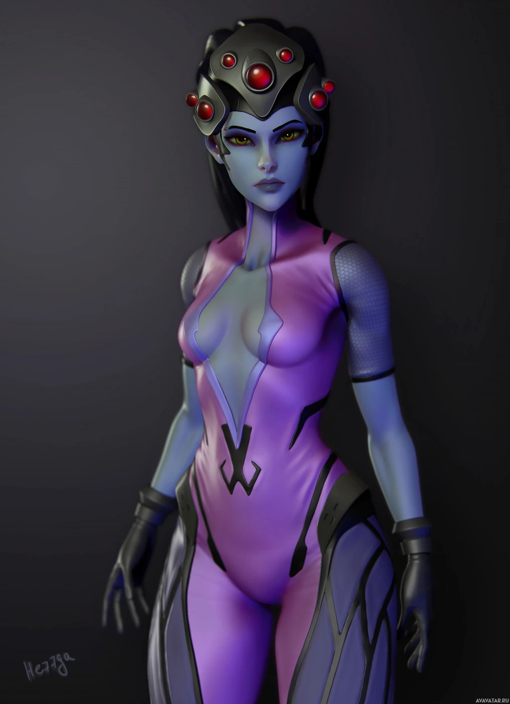 На изображении представлен 3D-рендеринг Вдоводела, персонажа из видеоигры "Overwatch". Она изображена в своем культовом фиолетово-черном костюме и характерном шлеме с красными светящимися глазами. Этот персонаж известен своей способностью стрелять из снайперской винтовки на большие расстояния.