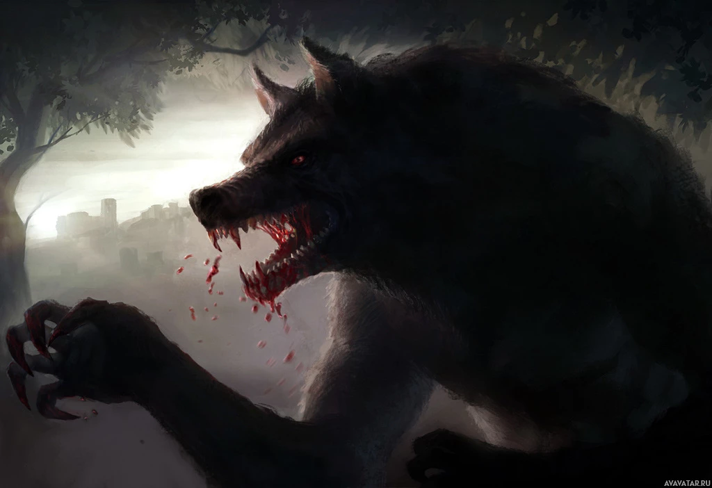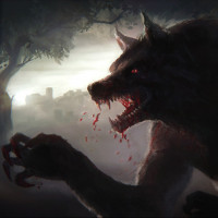 The image features a fantasy-style depiction of a werewolf. It appears to be set in an outdoor, possibly nocturnal, environment with trees and