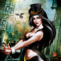 a female character wearing an Alice in Wonderland-style costume, which includes a black and yellow outfit and a black top hat. She has