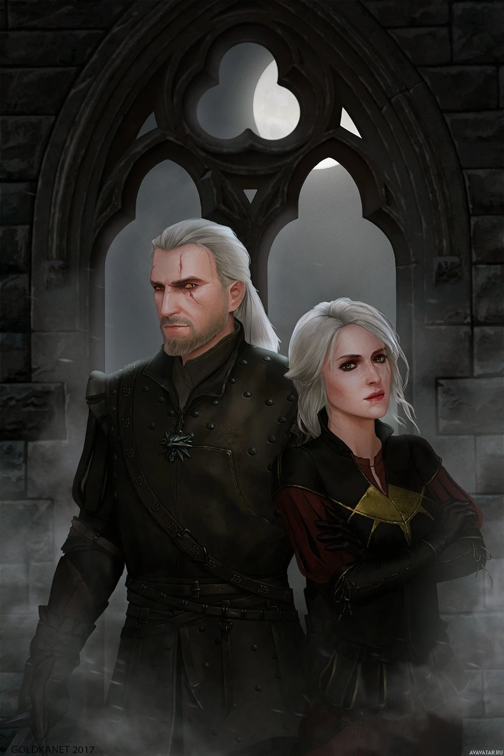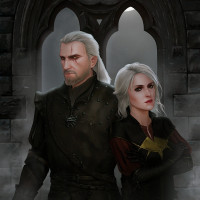 facial expression and is looking off to the side. To his right is Ciri, a powerful mage with