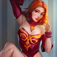 red hair and wears a red and gold armor with a flame emblem on it. The character is sitting on what appears to be a staircase or ledge, looking over her shoulder with