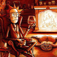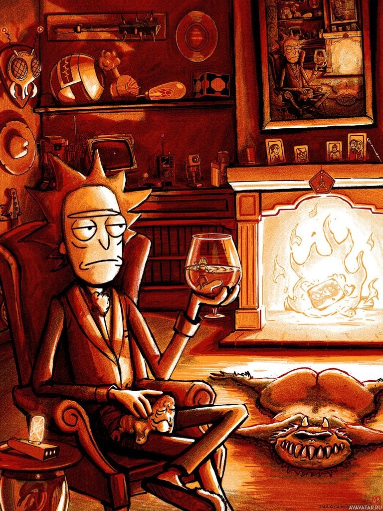 an animated character named Rick Sanchez, who is a scientist and the protagonist of the animated television series "Rick and Morty." He is depicted sitting in a chair with