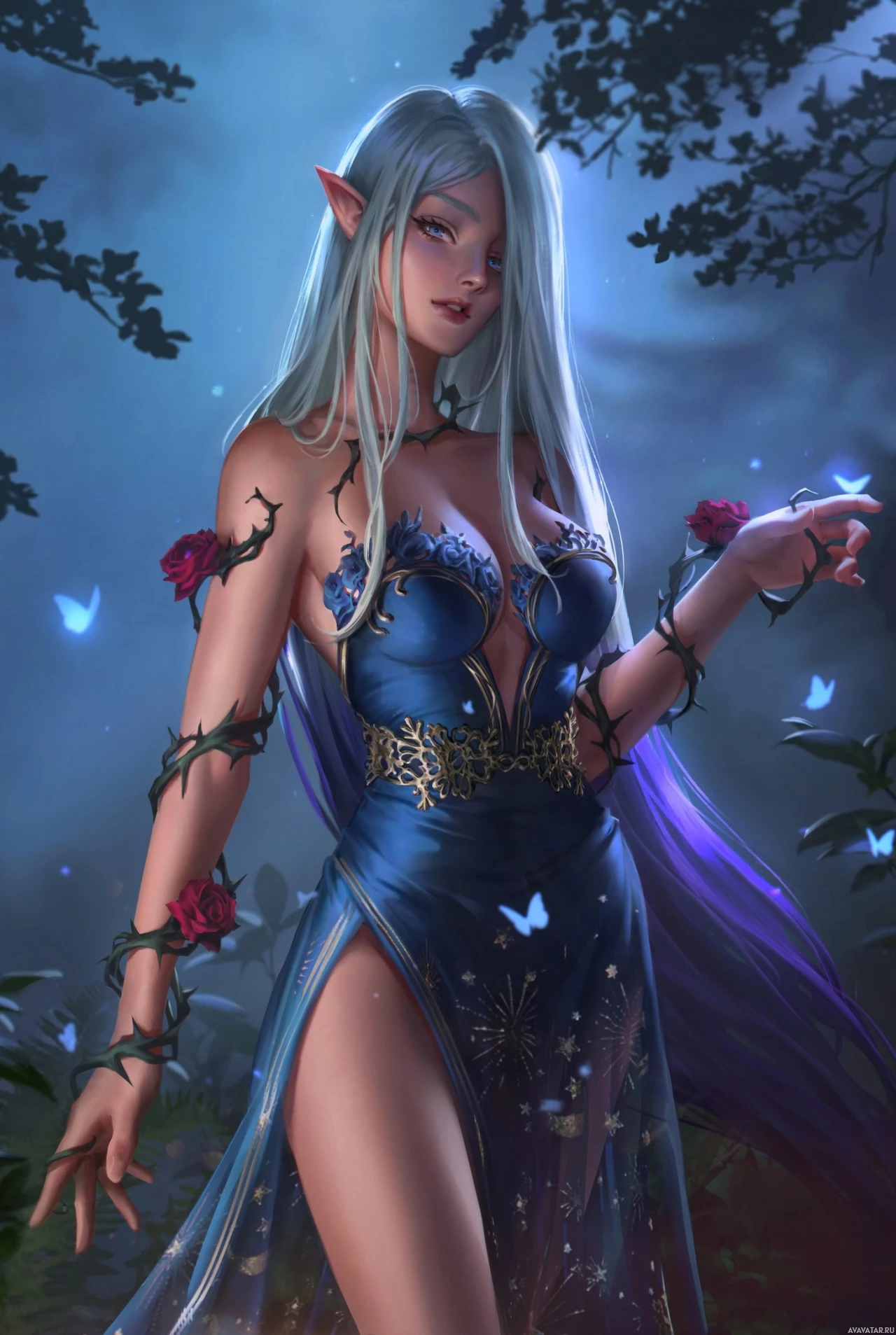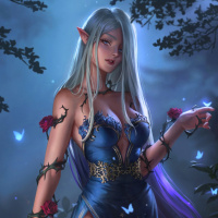 the surrounding environment which includes night sky elements and the silhouette of trees and foliage, adding a magical ambiance to her presence. The character's expression and the overall atmosphere suggest a scene from a fantasy or fairy tale setting, where magic and nature are intertwined.