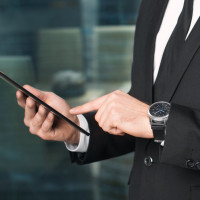a tablet PC in both hands, focusing intently on the screen. The background suggests an office or corporate setting with blurred elements that could be interpreted as financial documents or cityscape through