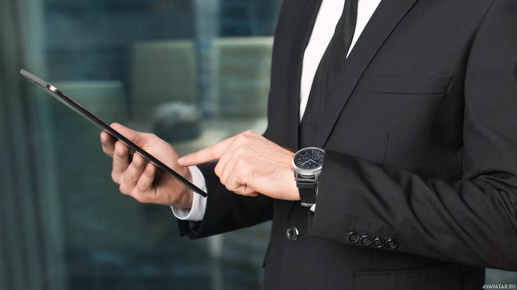 business attire, which includes a suit, tie, and a watch on his left wrist. He is holding