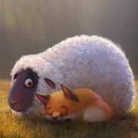 animated characters, a sheep and a fox, lying down on the grass. The sheep appears to be white with