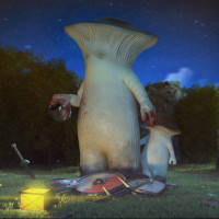 a forest animal or a companion to the mushroom character. They are situated outdoors at night, with the surroundings including what appears to be