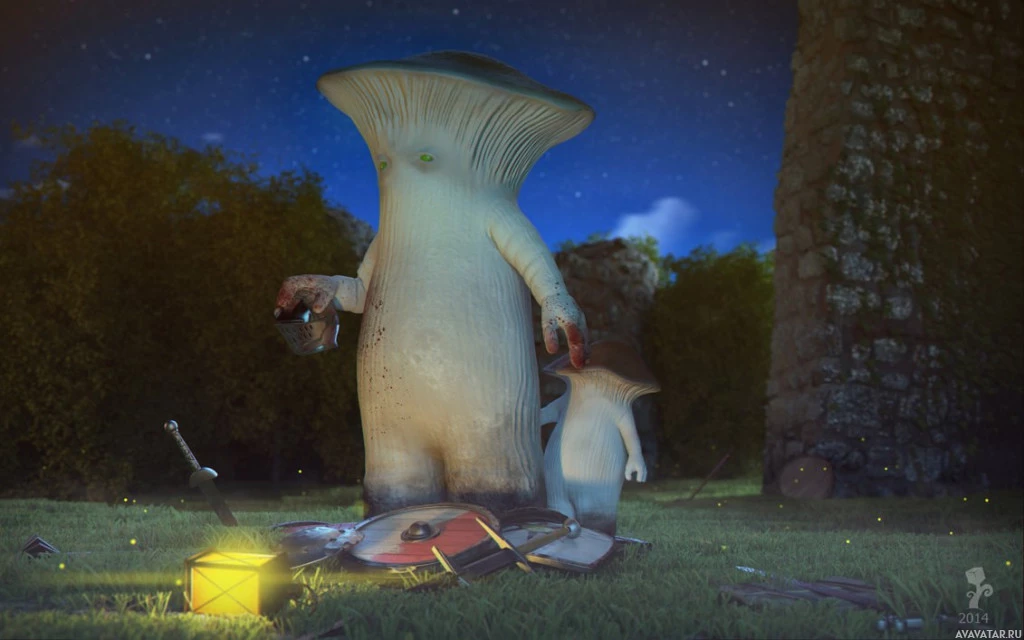 a fantasy scene featuring two mushroom-like characters. One of them has the appearance of a traditional mushroom and is significantly larger than the other, which resembles a smaller creature, possibly