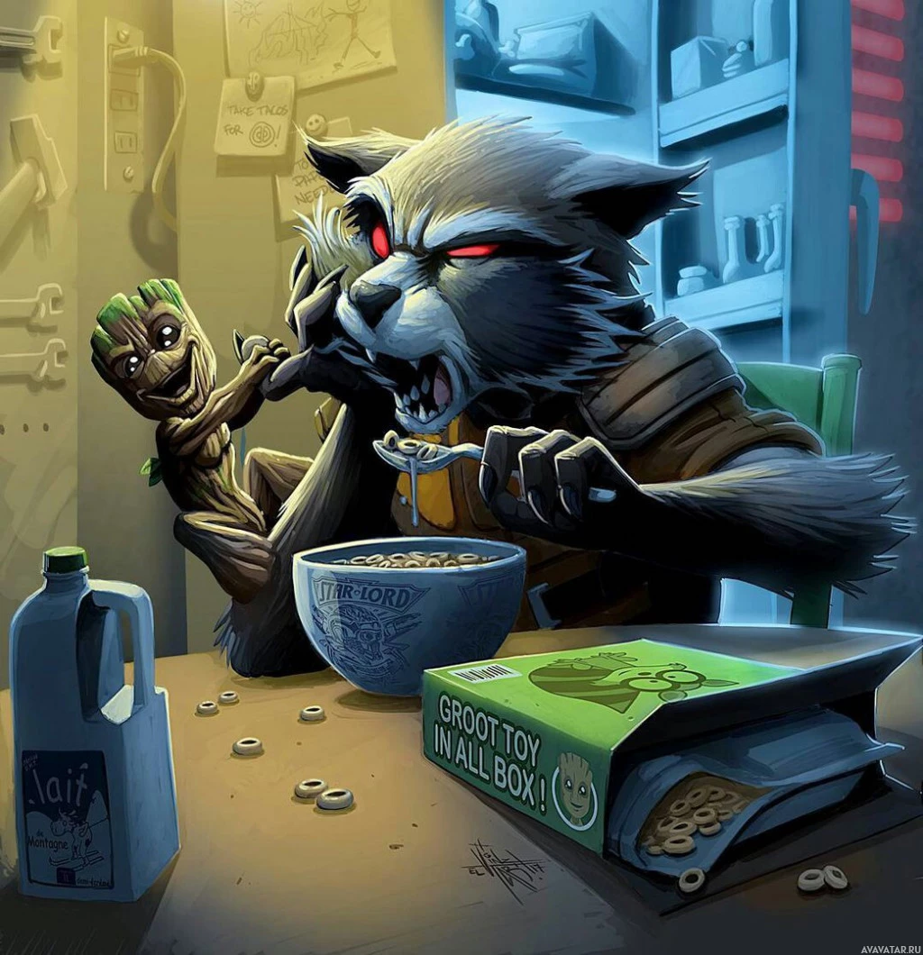 Rocket Raccoon and Groot from the Marvel Comics universe. They are seated at a table with