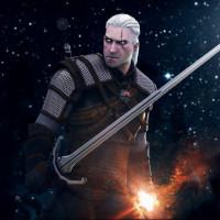 the video game series "The Witcher." He is depicted holding a sword and wearing armor, with an expression that suggests focus or readiness for battle. The background includes what appears to be