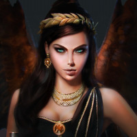 dark hair and is wearing what appears to be ancient Roman attire, including a golden crown and gold jewelry. Her eyes have an unusual blue glow which could suggest she is depicted as having
